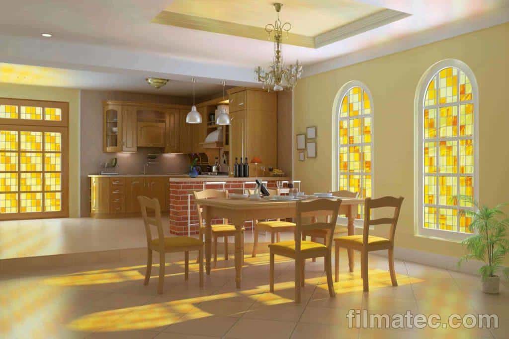 Ce film transforme le verre en vitrail. La lumière est juste tamisée sans être altérée.