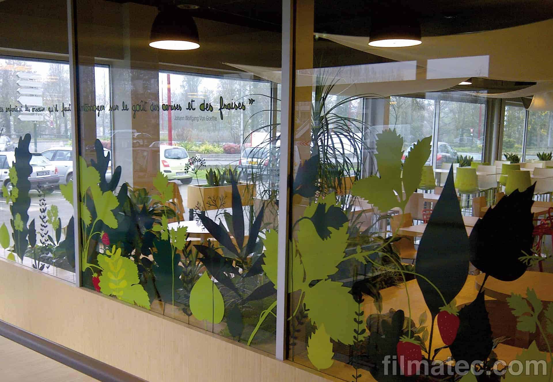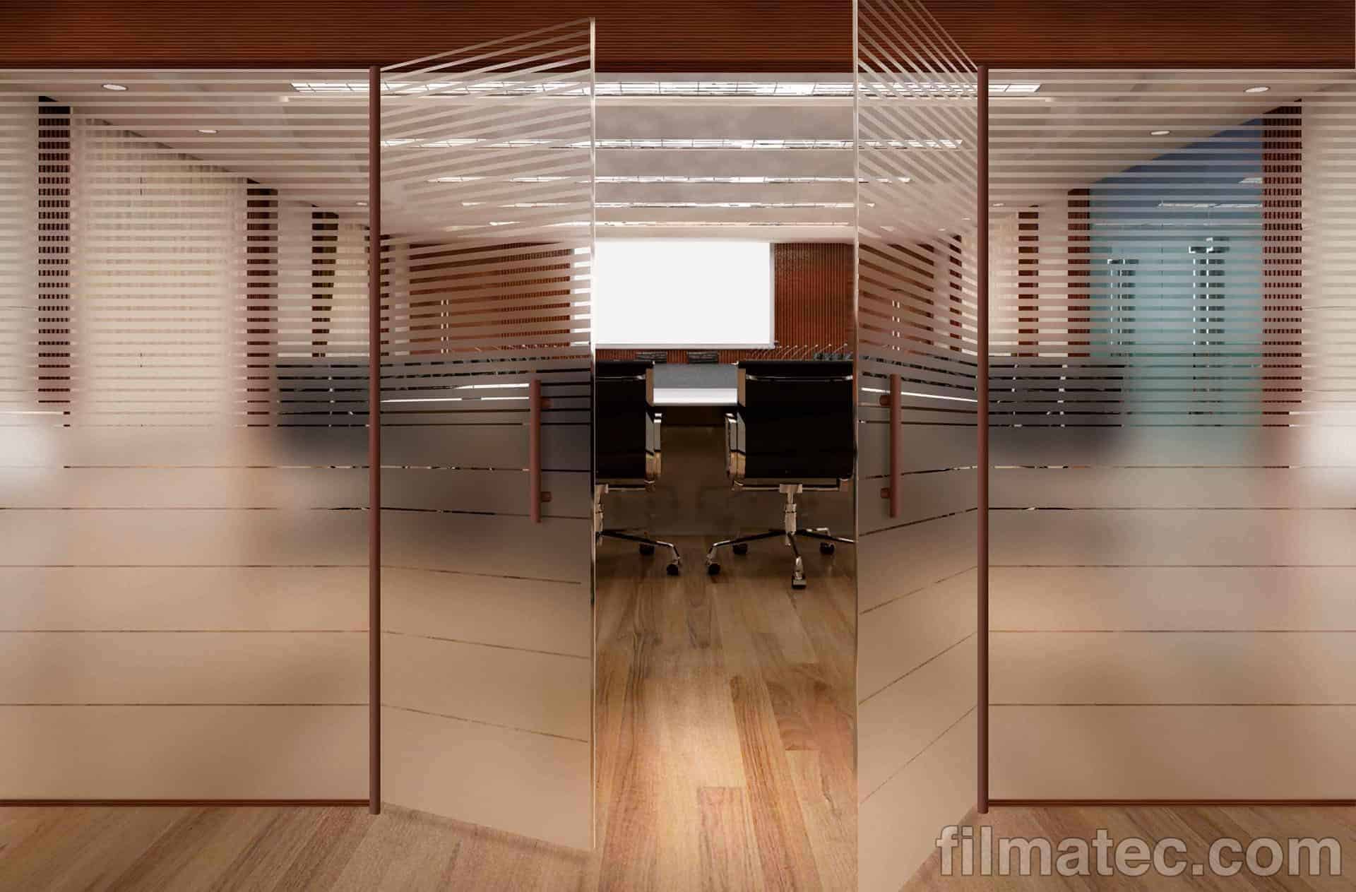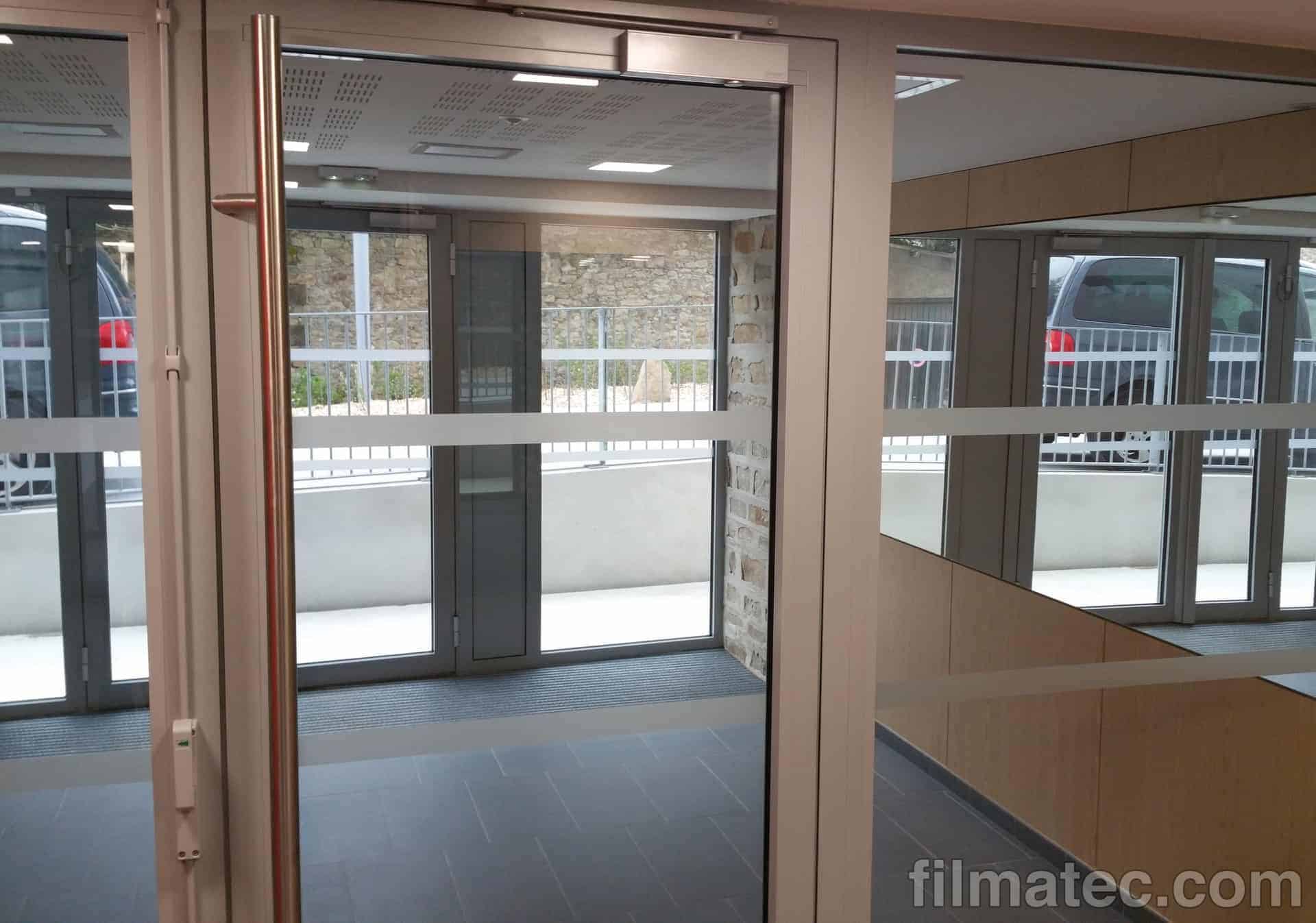 Les films décoratifs permettent de personnaliser une fenêtre, une cloison ou un meuble en verre tout en préservant l’intimité. Ces films adoucissent la lumière sans réduire la luminosité.nnSur cette image, vous visualiserez le film INT 237 en bas du vitrage et le film INT 236 au haut.
