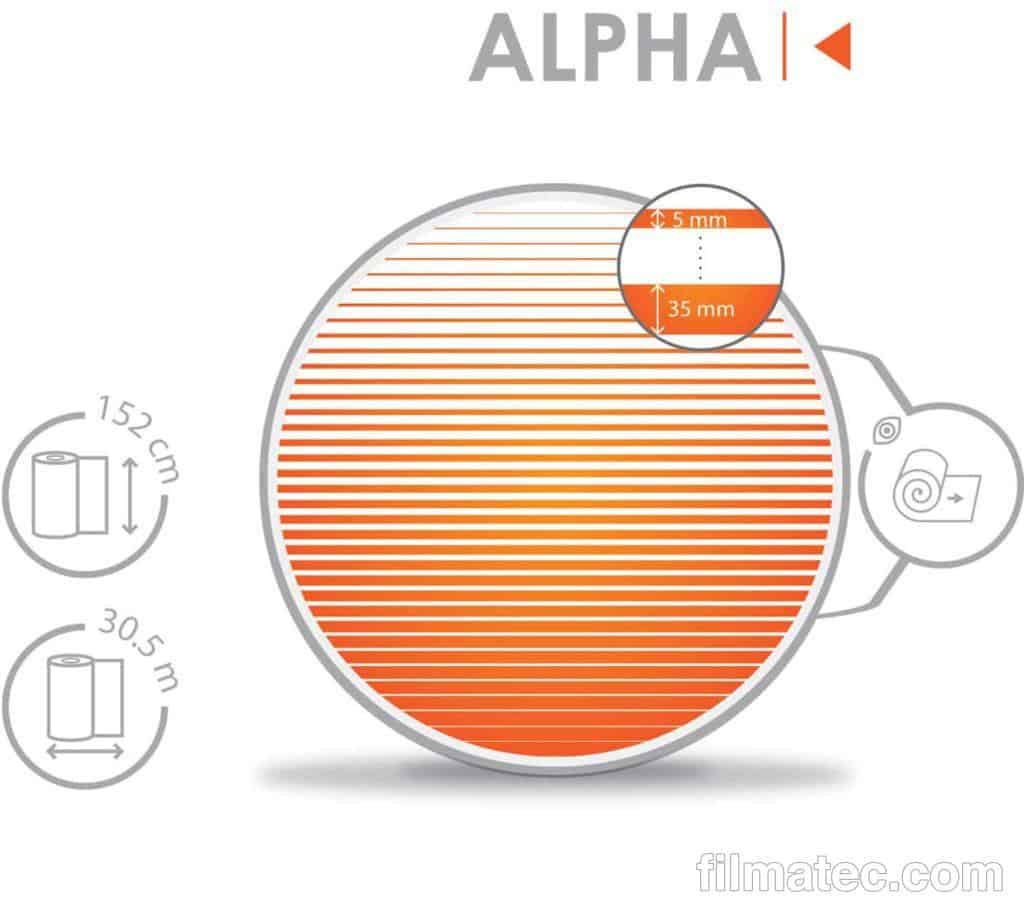 Le film décoratif Alpha personnalise vos vitrages ou cloisons. Il est orné de lignes blanches séparées par des espaces clairs, dégradés de 35 à 5 mm.