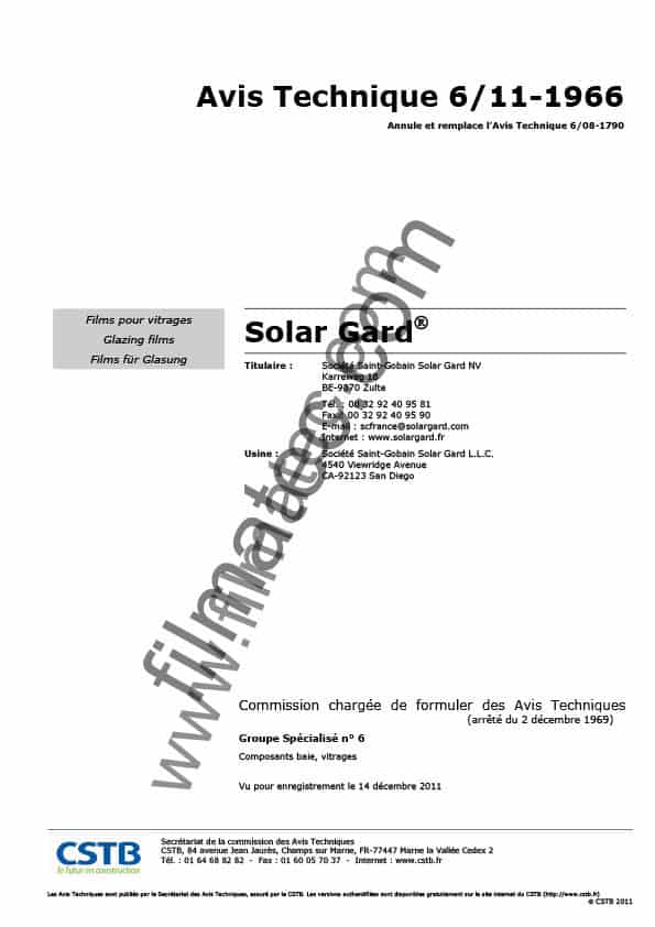 Avis Technique 6/11-1Extérieur6 concernant les films pour vitrage.