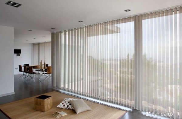 Le système à Bandes Verticales peut couvrir des dimensions jusqu’à 6m de largeur et 6 metres de hauteur, idéal pour les grandes surfaces vitrées.